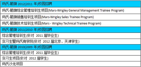 由上表信息可以看出,瑪氏每年校園招聘開放的都是管理培訓生職位,并在暑假期間進行暑期實習生職位的招聘。總體上,其招聘崗位和崗位要求相對比較穩定。值得一提的是,2012校園招聘中,除綜合管理培訓生外,瑪氏又增加了銷售培訓生與技術培訓生職位,這顯然體現出公司高層對兩個方向人才的重視。預計在今后的校園招聘中,這兩個職位仍將向有志于瑪氏的同學繼續開放。