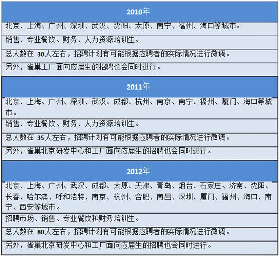 從上表可以看出,近三年雀巢招聘的人數逐年上升,并且從 2010年的北上廣、省會城市增加了一些二線城市。說明雀巢正處于發展階段,需要在中國一二線城市招募大量的人員,而且大多為培訓生。雀巢為應屆畢業生提供了大量的崗位,在英語溝通方面有所有要求。