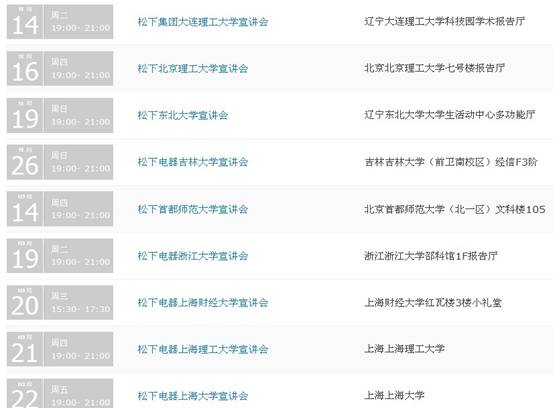 注意:2014年校園宣講會未必如此,因此請經常關注應屆畢業生網宣講會查詢系統,以便得到最新最準確的松下校園宣講會信息。