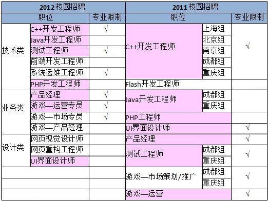首先,2011、2012兩屆校園招聘對所招職位采取了不同的分類方式。2011屆校園招聘職位主要根據地區進行分類,且目標地區主要聚焦在西南地區城市,以成都、重慶為典型;2012屆招聘崗位則根據職能部門予以分類展示,各崗位招聘的目標城市上較往屆也有了極大的擴展。值得一提的是,當年騰訊也采用了這樣的職位分類方式。由此可以看出紅帽向行業高標準看齊,尋求在全國范圍內高速發展的決心。