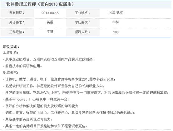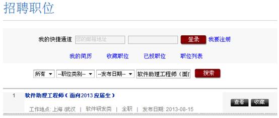 3、應屆畢業生應選擇“應屆生招聘職位”下列出的職位。找到目標職位,點擊標題進入即可。以“軟件助理工程師”為例,點擊“軟件助理工程師”進入,頁面會跳轉到招聘職位欄目有關軟件助理工程師的招聘信息,繼續點擊“查看”進入即可。