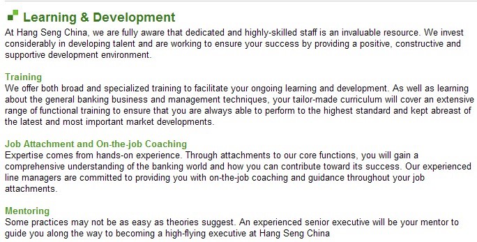 All the above streams will provide you with dynamic and challenging classroom training, on-the-job training and attachment across a wide range of banking functions in Mainland China as well as an attachment in HK. This experience will allow you to build the managerial and technical skills needed for future development and more senior management responsibilities in our China business.