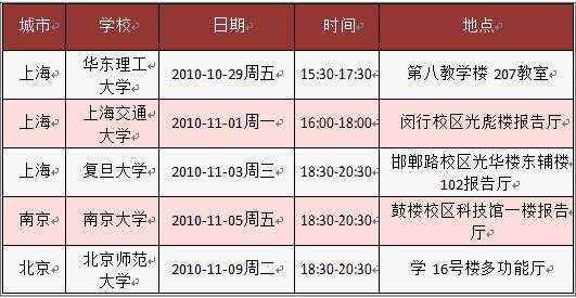 未能在簡歷截止時間之前完成網絡申請的畢業生同學,請在專場招聘宣講會現場投遞應聘簡歷。各地安排如下表:
