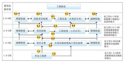 龍湖地產對于職能高層的任職經驗要求是:主修+輔修。主管的領域必須是主修;輔修的可以不是核心職能。龍湖為每個職能都設計了相應的發展路徑,以工程職能為例,下圖就描述了一個工程副總可能的發展路徑和時間(演示版,以公司內部政策為準):