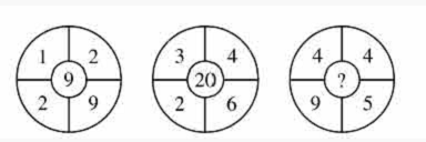 五、圖形推理。(共5題,每題2分)(1)每題圖形中的數字都包含一定的規律,請你總結前面兩個圖形中數字的規律,從四個選項中選出你認為問號應該代表的數字。請看例題:【例題1】