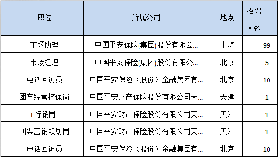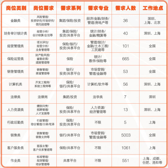 其中,集團及各專業公司總部需求,主要集中在北京、上海、西安、武漢等地區高校,專業以金融、財務、法律、管理、計算機為主,需求約400人;全國各地區分公司需求,遍布全國各大城市院校,專業覆蓋面廣,需求約3100人;新渠道外勤電銷業務員,需求約4000人。
